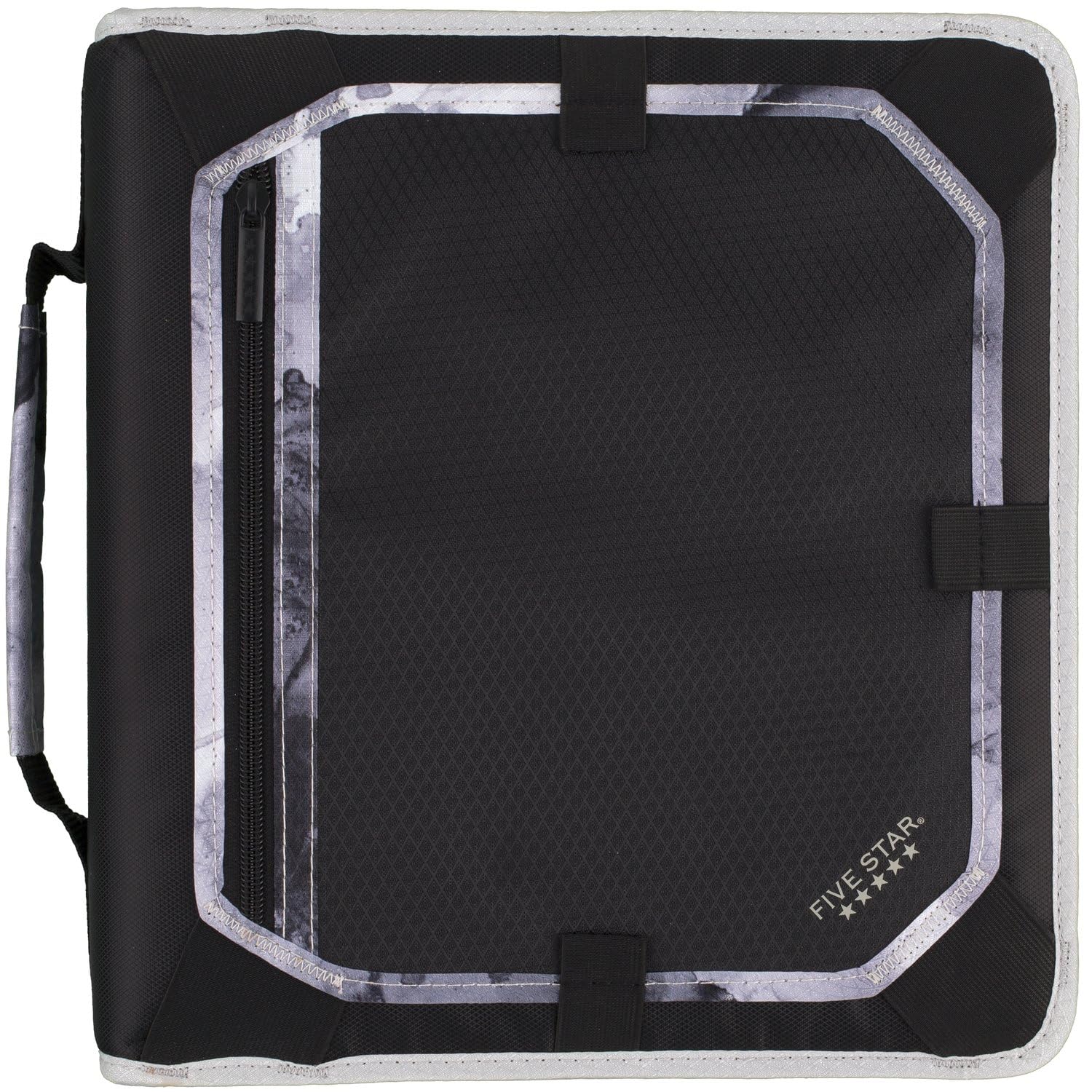Details: LASTS ALL YEAR. GUARANTEED!* Binder is built strong to keep up with you all year long. Binder has a full zipper closure and handle to easily carry between classes. Expansion panel on the outside of the binder allows you to store and access textbooks, notebooks and more without unzipping the binder. Get organized with 5-tab expanding file that holds up to 200 loose sheets. 3-ring fixture holds up to 380 letter size sheets.** Pocket securely stores supplies. Also includes a micro-mesh pocket with zipper closure. Full zipper closure and carrying handle allows you to be on the go. Measures 2 1/2" x 12 3/4" x 12". Available in Black/Gray. *Guarantee is valid for one year from purchase date. Does not cover misuse. Go to fivestarbuiltstrong.com for details. **Sheet count capacity is measured by using 15 lb. Filler Paper.