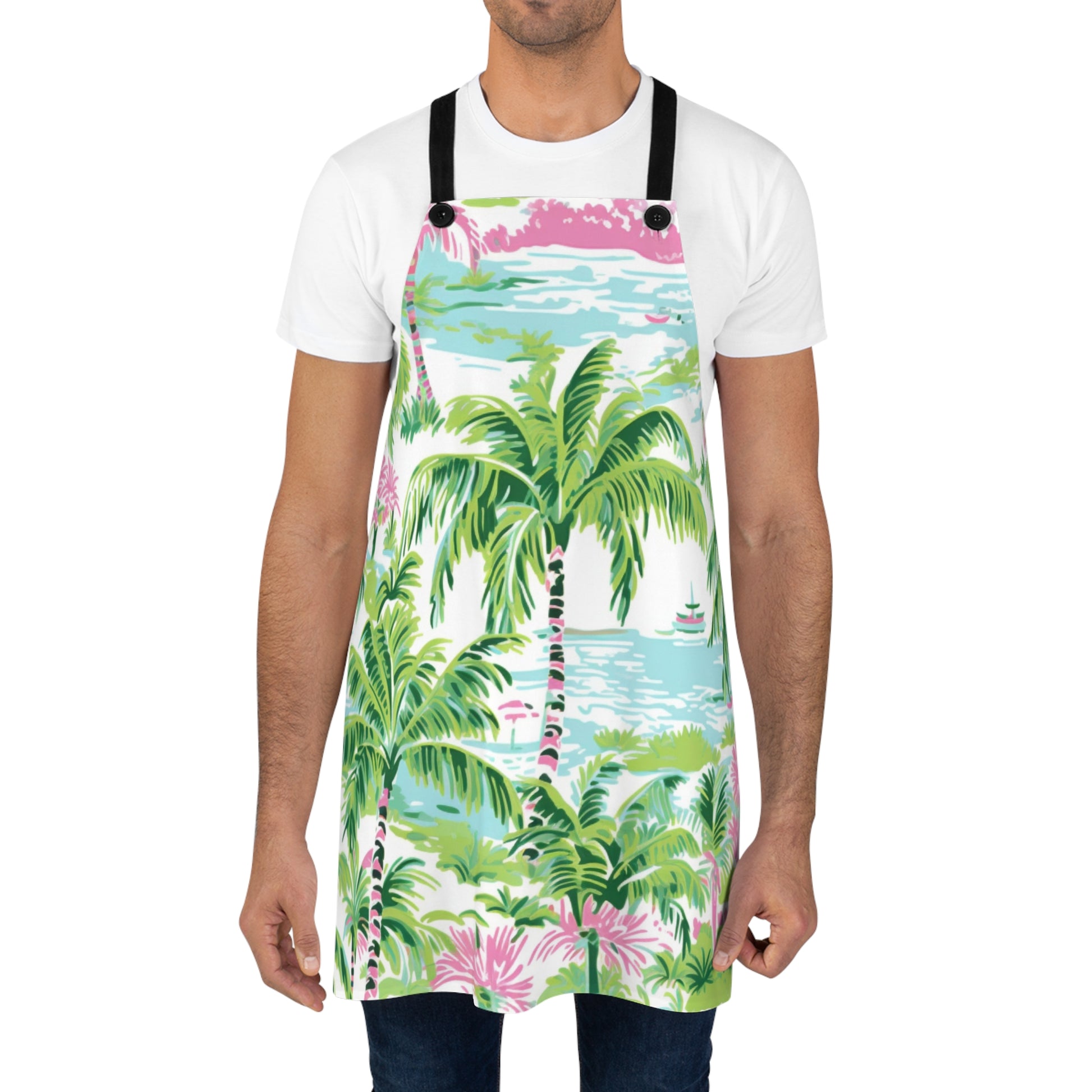 Elevate your culinary adventures with our Preppy Tropical Ocean Apron, featuring a vibrant design of pink and green palm trees in a tropical ocean setting. This apron is perfect for those who love to bring a touch of paradise into their kitchen.