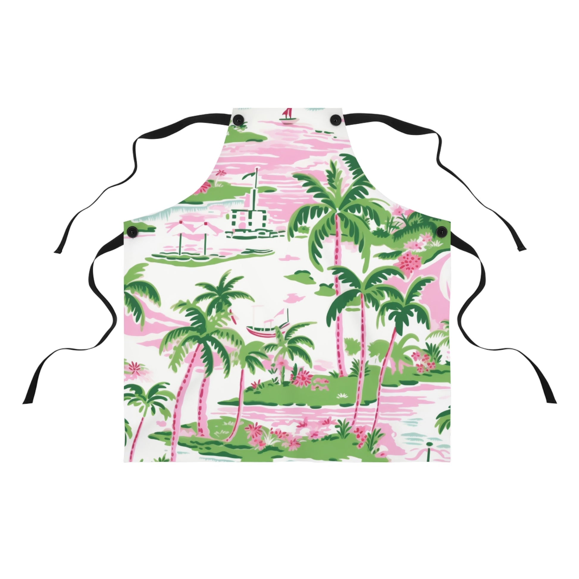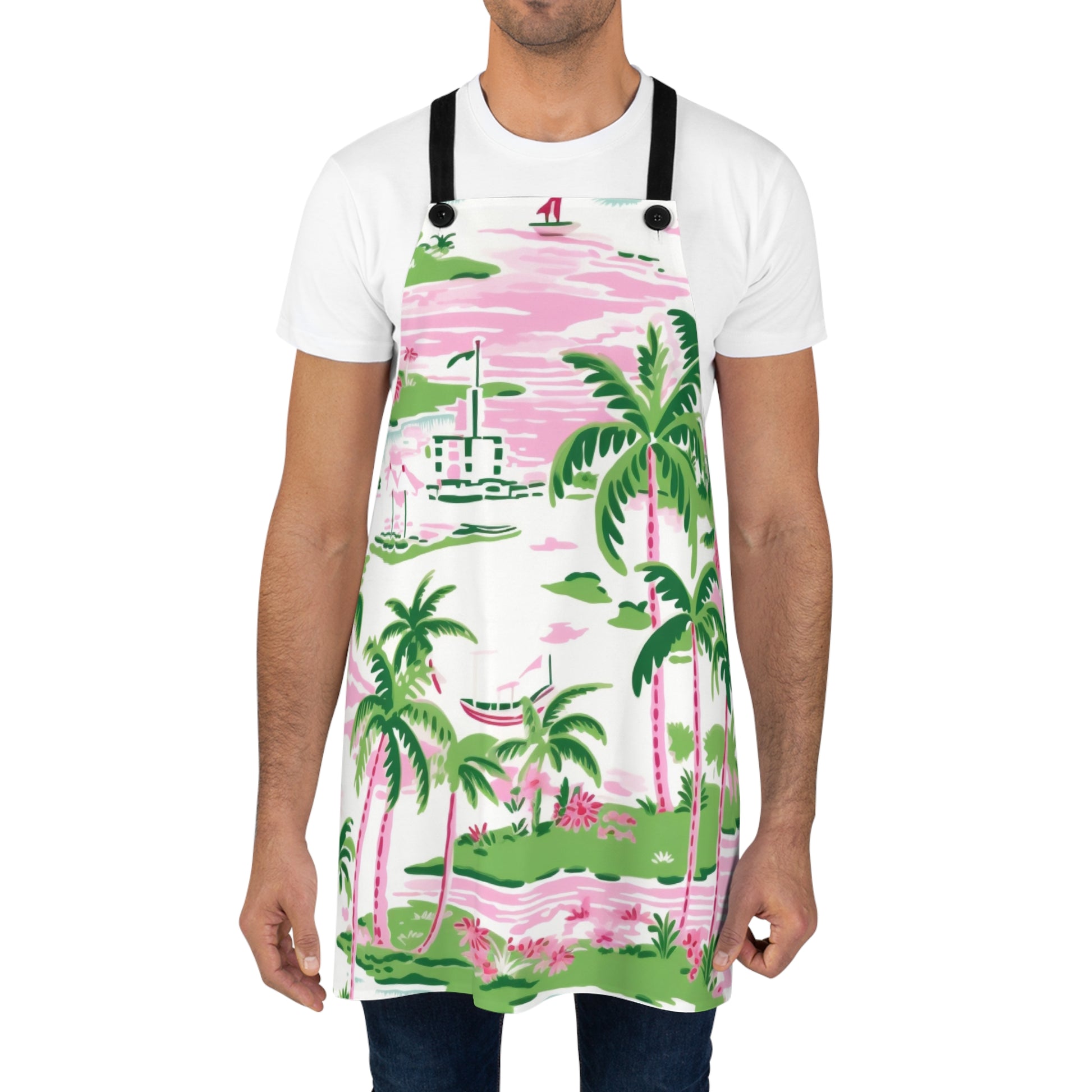 Elevate your culinary adventures with our Preppy Tropical Pink Apron, featuring a vibrant design of palm trees and tropical elements in stunning shades of green and pink. This apron is perfect for those who love to bring a touch of paradise into their kitchen.